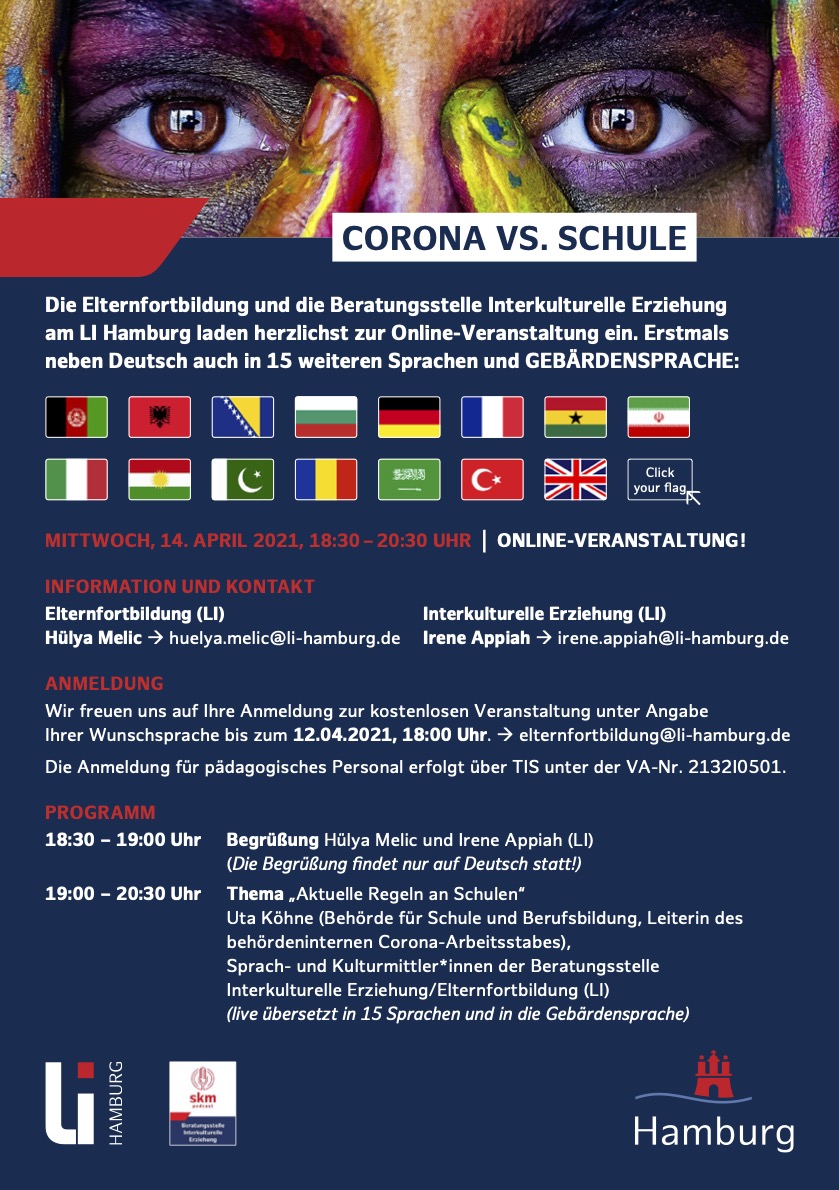die Elternfortbildung und die Beratungsstelle Interkulturelle Erziehung am LI Hamburg laden herzlichst zur Online-Veranstaltung ein. Erstmals neben Deutsch auch in 15 weiteren Sprachen und Gebärdensprache.